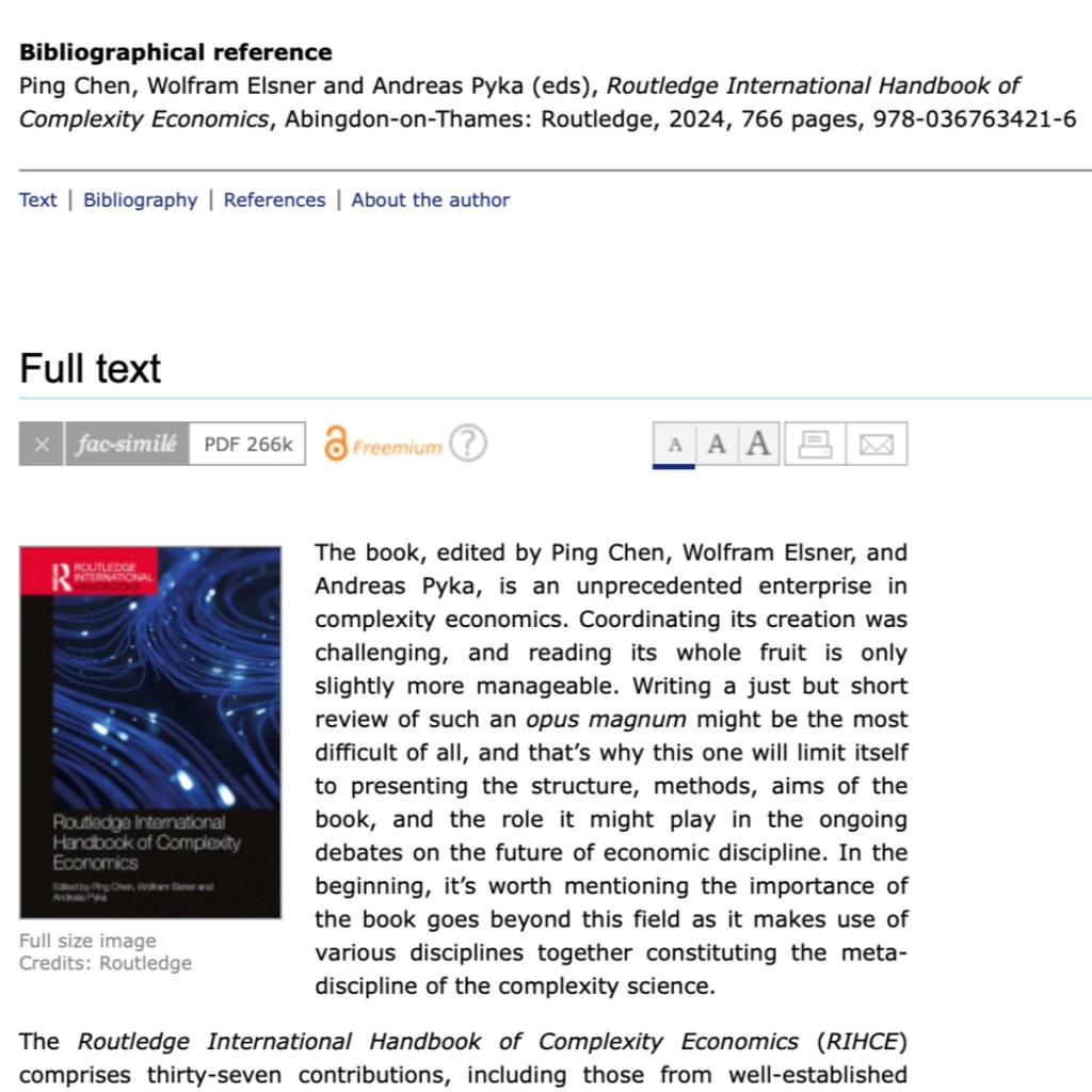 Ping Chen, Wolfram Elsner, Andreas Pyka [eds.], Routledge International Handbook of Complexity Economics (book review)