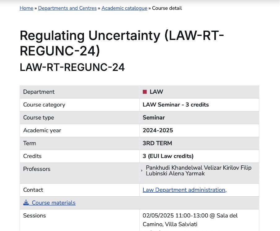 We invite all of the European University Institute researchers to the 2024/25 seminar (Department of Law) Regulating Uncertainty.