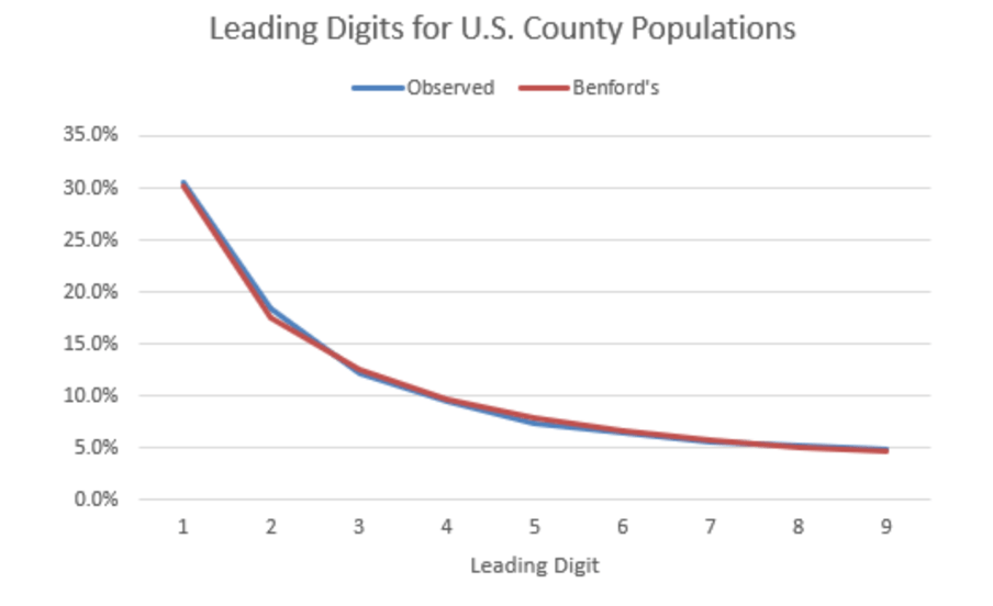 When applied to extensive datasets, the correlation with the pattern is often hard to believe. The collected values of the U.S. counties’ populations are an example.