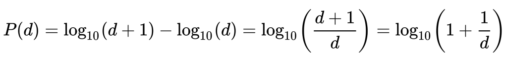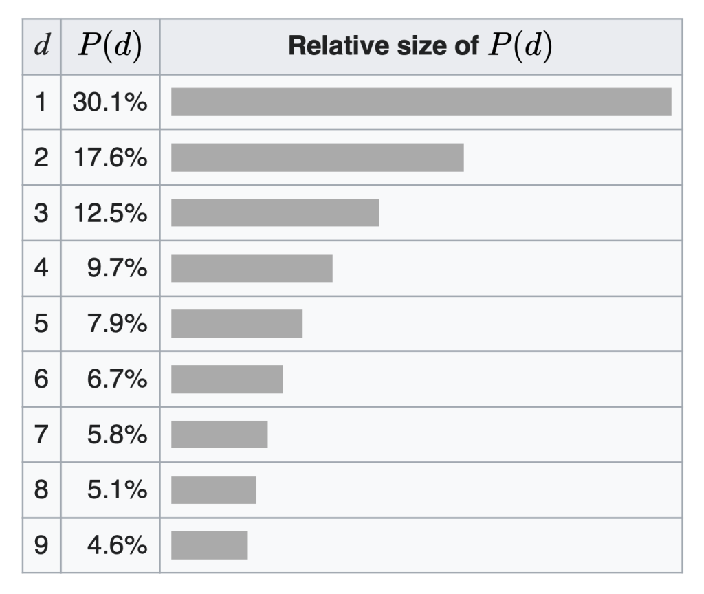 Beware. This paragraph is about to introduce what is sometimes called “the most counter-intuitive law” in mathematics. Fortunately, even if the statement is correct, the law is at least very easy to explain. Benford’s Law is an observation that in many real-life sets of numerical data, the leading digit is likely to be small. In other words, the share of numbers starting with a specific digit in a real-world dataset decreases as the value of the digit increases. Here is where the most interesting part begins. This observation is not only correct for the large majority of these sets, but most of them also have a distribution of leading digits very close to the pattern calculated by Benford based on his extensive research in the 1930s (he has tested it on data from twenty different domains – the surface areas of 335 rivers, the sizes of 3259 US populations, 104 physical constants, 1800 molecular weights, 5000 entries from a mathematical handbook, 308 numbers contained in an issue of Reader’s Digest, and the street addresses of the first 342 persons listed in American Men of Science).