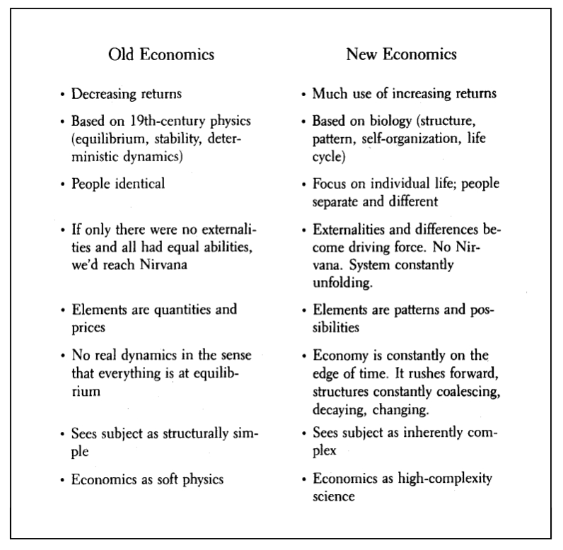 Arthur found all his 1980s rejections double-frustrating when he realized that, while he was stuck in editorial limbo, the idea of increasing returns was finally beginning to catch on. This process started to a large degree thanks to contemporary research in economic history. In Arthur’s day, Stanford University had a first-rate group of economic historians – the people who conducted empirical studies of the history of technology and the origins of industries. For years, they had suffered from the fact that the ‘old’ economics, “if really taken seriously, says that history is irrelevant. An economy in perfect equilibrium exists outside of history; the marketplace will converge to the best of all possible worlds, no matter what historical accidents intervene” (Mitchell, 1993, p. 50). In other words, contemporary economics departments behaved as if ‘history doesn’t exist’ and considered scrapping their required courses in economic history. Some economic historians saw Arthur’s arguments on increasing returns as providing them with a rationale for their existence. They liked the idea that small events could have significant consequences. Historians embraced the concept of economics as a “high-complexity science” (see table above).